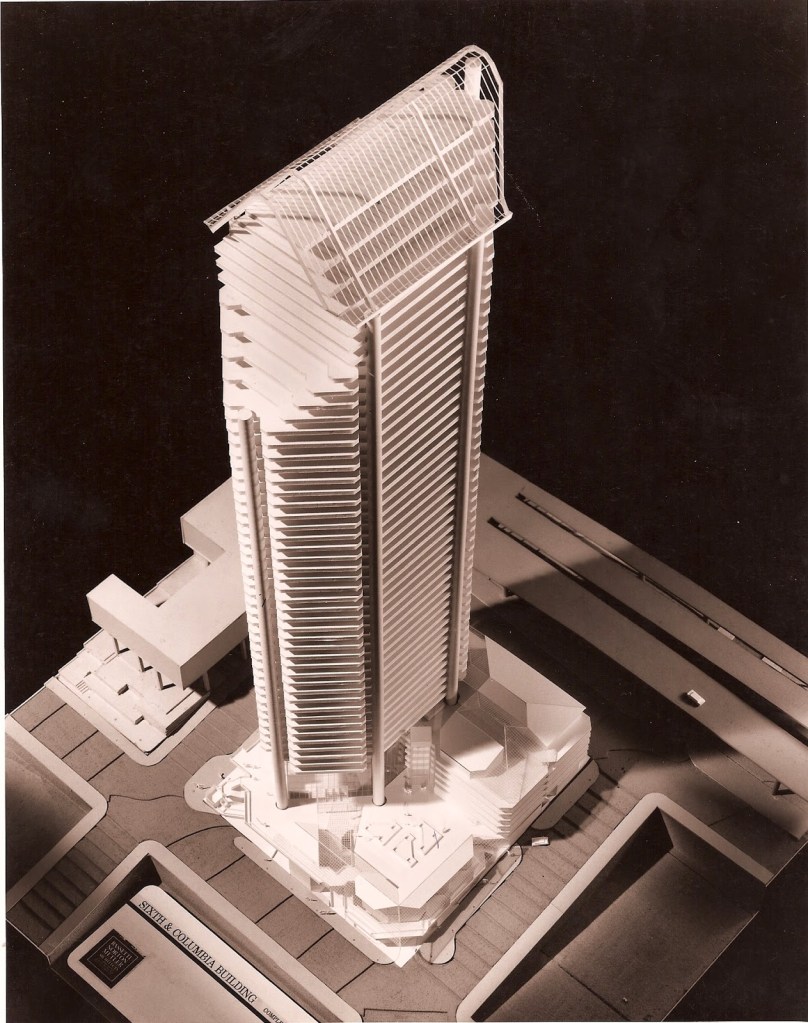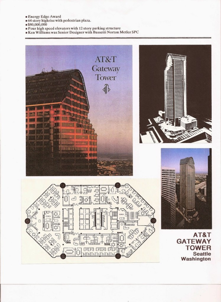 The other example is an attempt to combine financial interests with commonplace zoning by means for design performance. Designed by the late Fred Bassetti FAIA, The Metropolitan Building ( Met ) is a product of “Incentive Zoning” also described as Floor Area Ratio (FAR.) When working on the structure in the mid eighties, the building became a product of zoning incentives. At that time, Seattle had experienced a number of tall, anonymous `Modern’ buildings. An example is the Seattle Center Building which dwarfs the `Met.’ At that time, Incentive Zoning was referred to as “Perk” Zoning. The location was zoned with a restrictive allowable height restriction. To encourage developers to construct, `Perks’ were granted per Zoning allowances. On the other side of the coin, the Developer’s incentive, financial, demanded a square footage for return on his investment. Bassetti’s `problem’ was to design a structure which provided features municipal planners would provide allowances for. Public space at street levels, allowed additional floors. Public Parking provisions allowed additional floors. Setback to allow sunlight into the the surrounding streetscapes resulted in more floors. An internal `mall-like plaza provided more, as did the commercial plaza on the upper street level. There the site was limited to approximately half the stories and size, by judiciously adding features resulted in the increase in floors to meet the developer’s spatial requirements. To better illustrate the design concepts, attached are images of the Design model which communicates the streetscape features and setbacks, allowing the heights to increase. Also included with these exhibits are example sheets further illustrating design materials, construction documents and images of the completed construction.